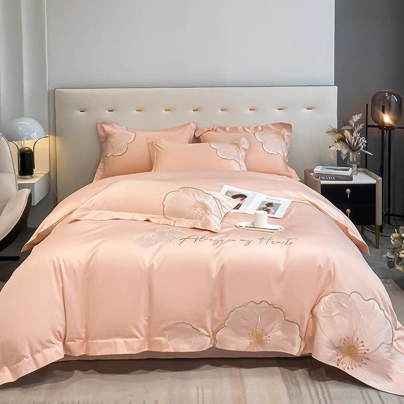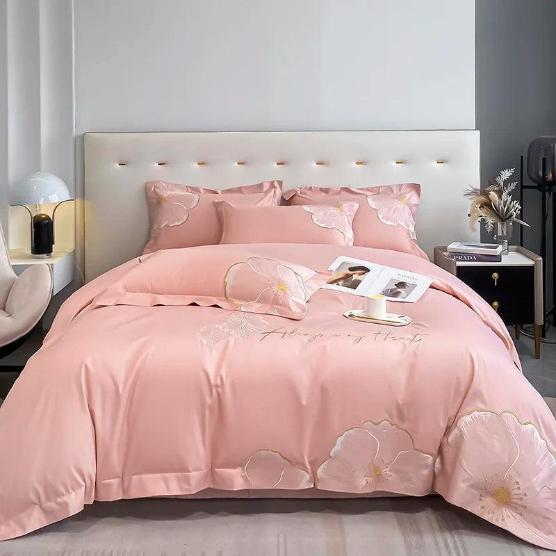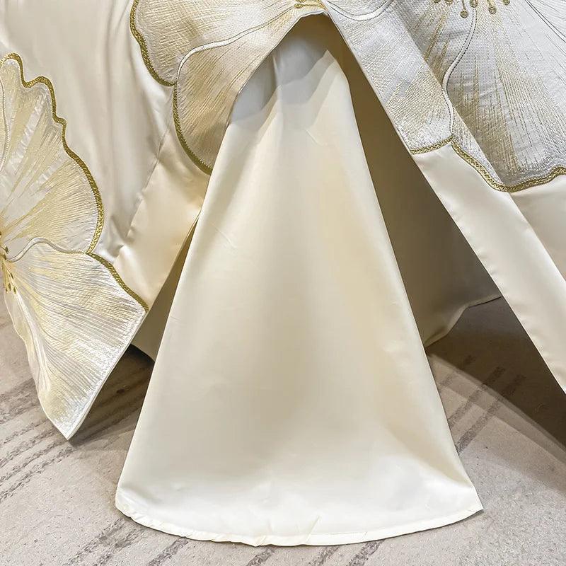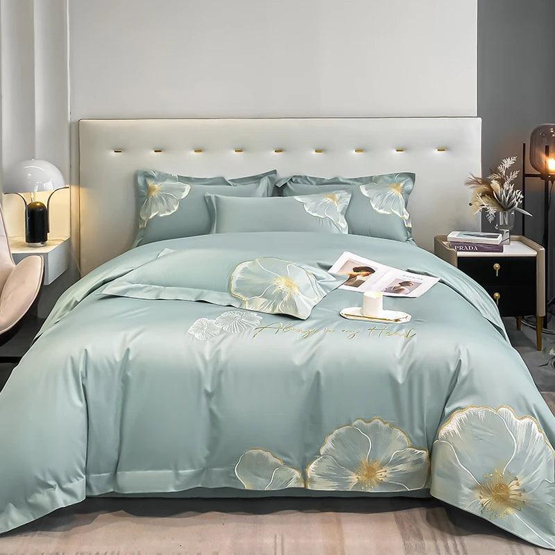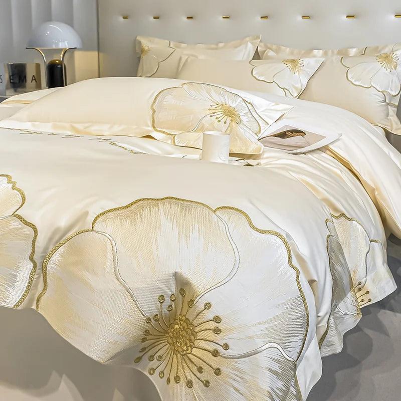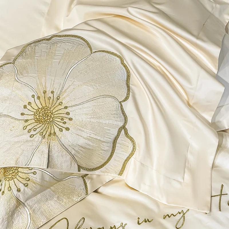 Design Exclusivo: Cada peça é adornada com bordados dourados delicados, evocando a beleza das flores e adicionando um toque de sofisticação ao seu quarto.