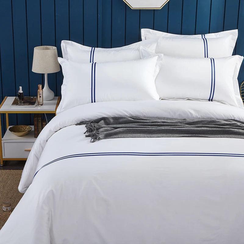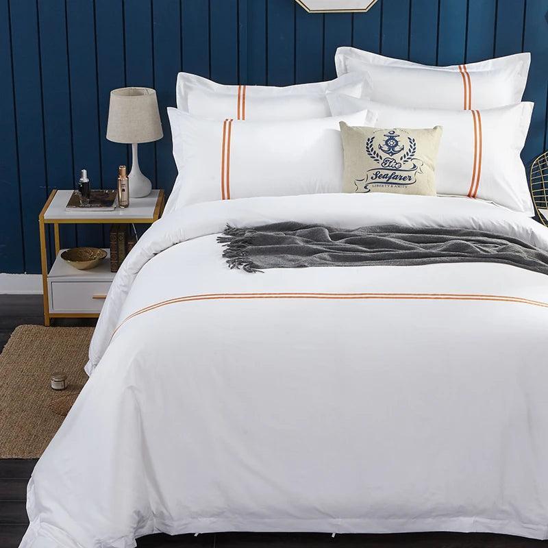 Design Clássico e Atemporal: As linhas limpas e as bordas coloridas adicionam uma elegância discreta ao seu quarto.